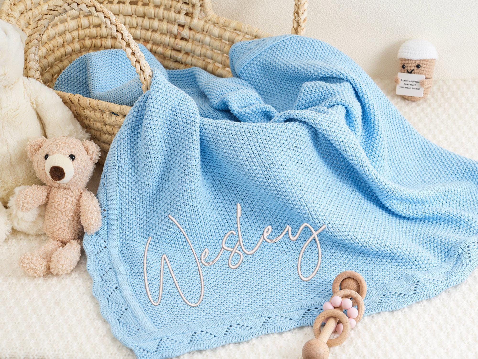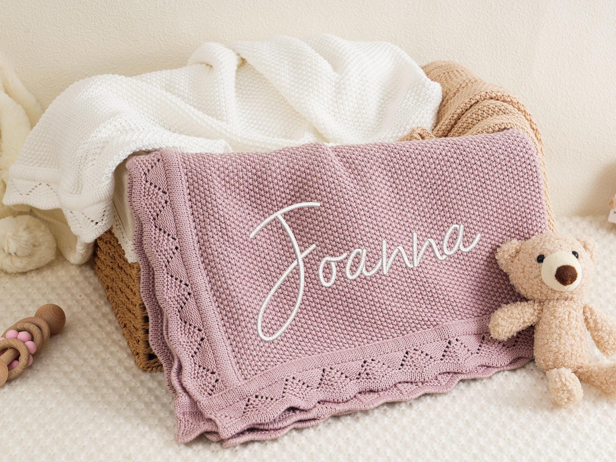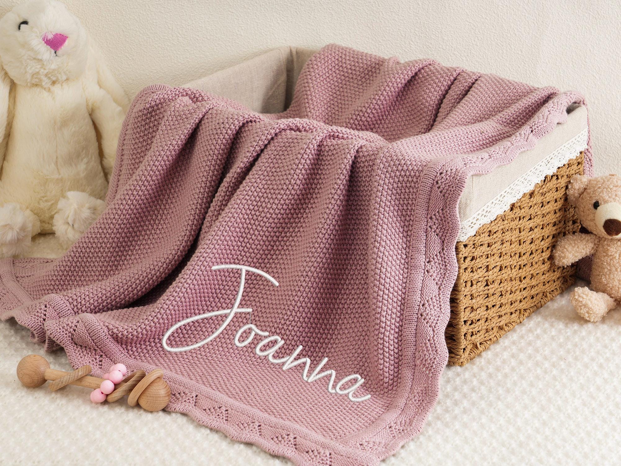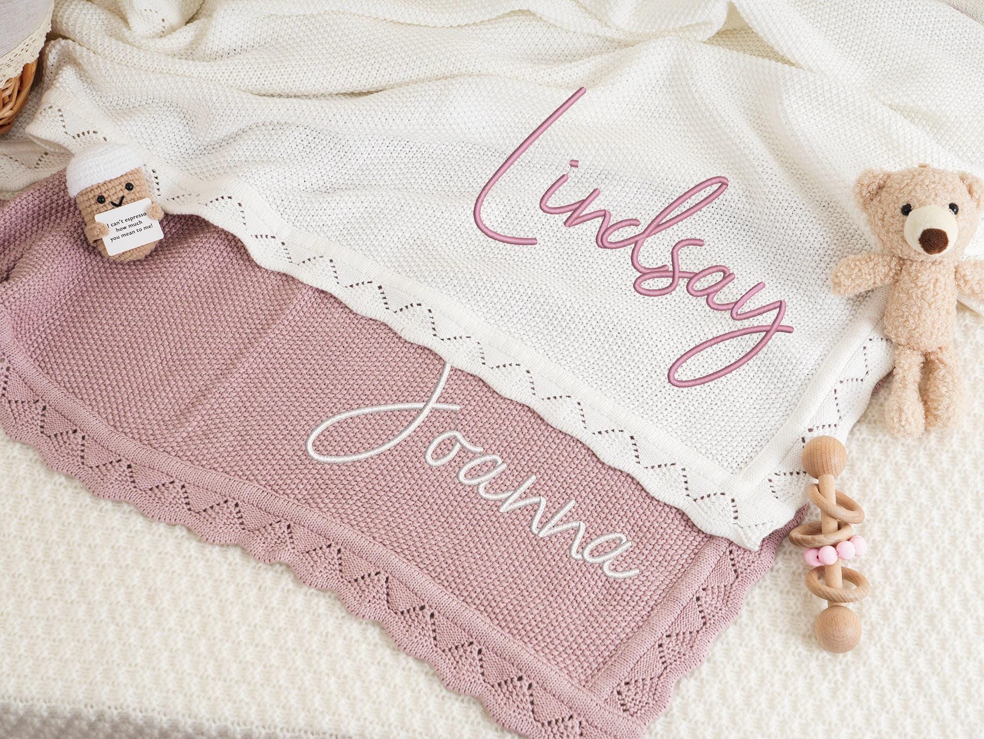 Bestickte Namensstrickdecke, Gestrickte Baby-Namensdecke mit Rüschenrand, Baby-Shower-Geschenk, Neues Baby-Geschenk, Namensdecke für Mädchen, Rosa Babydecke