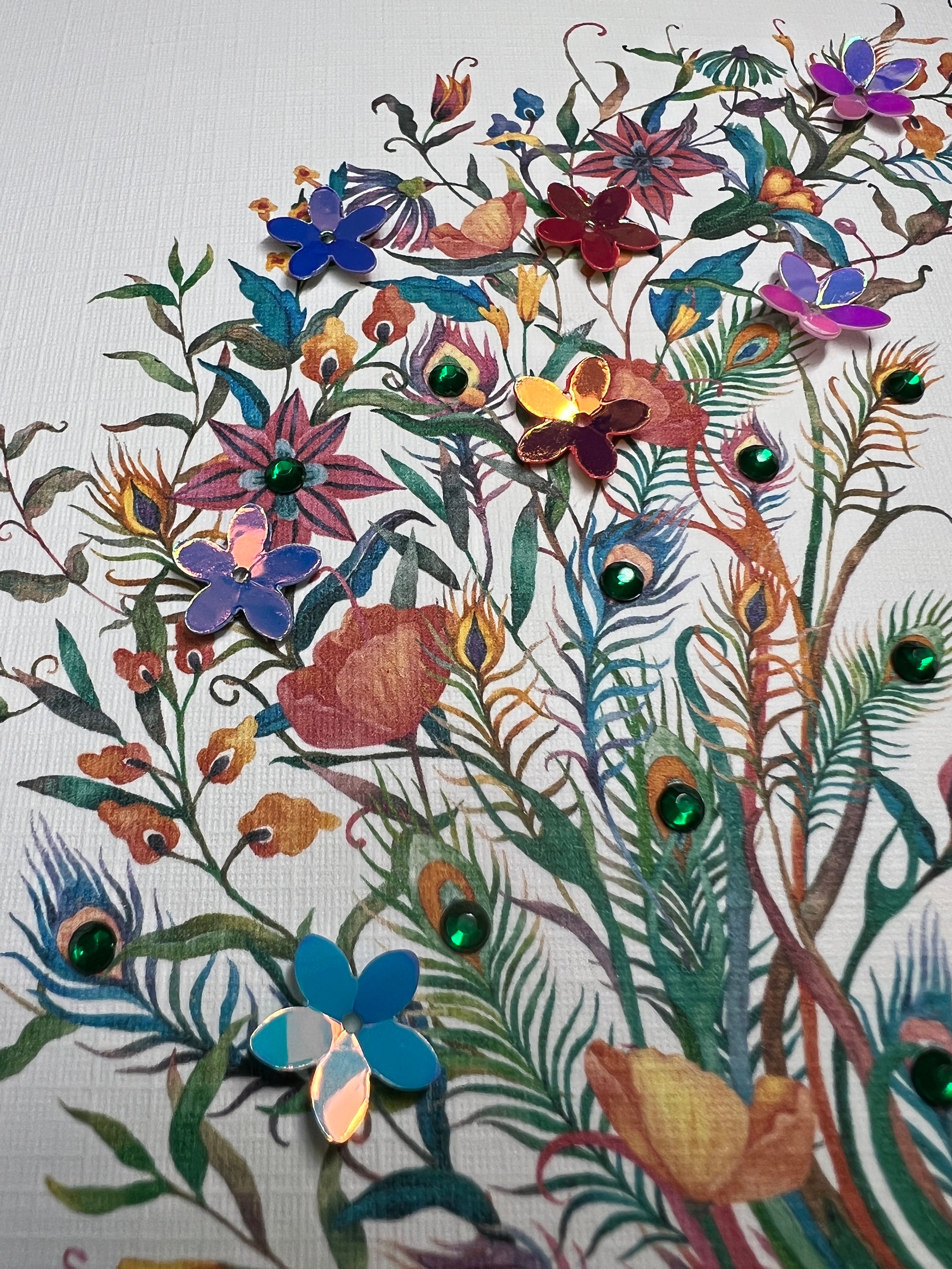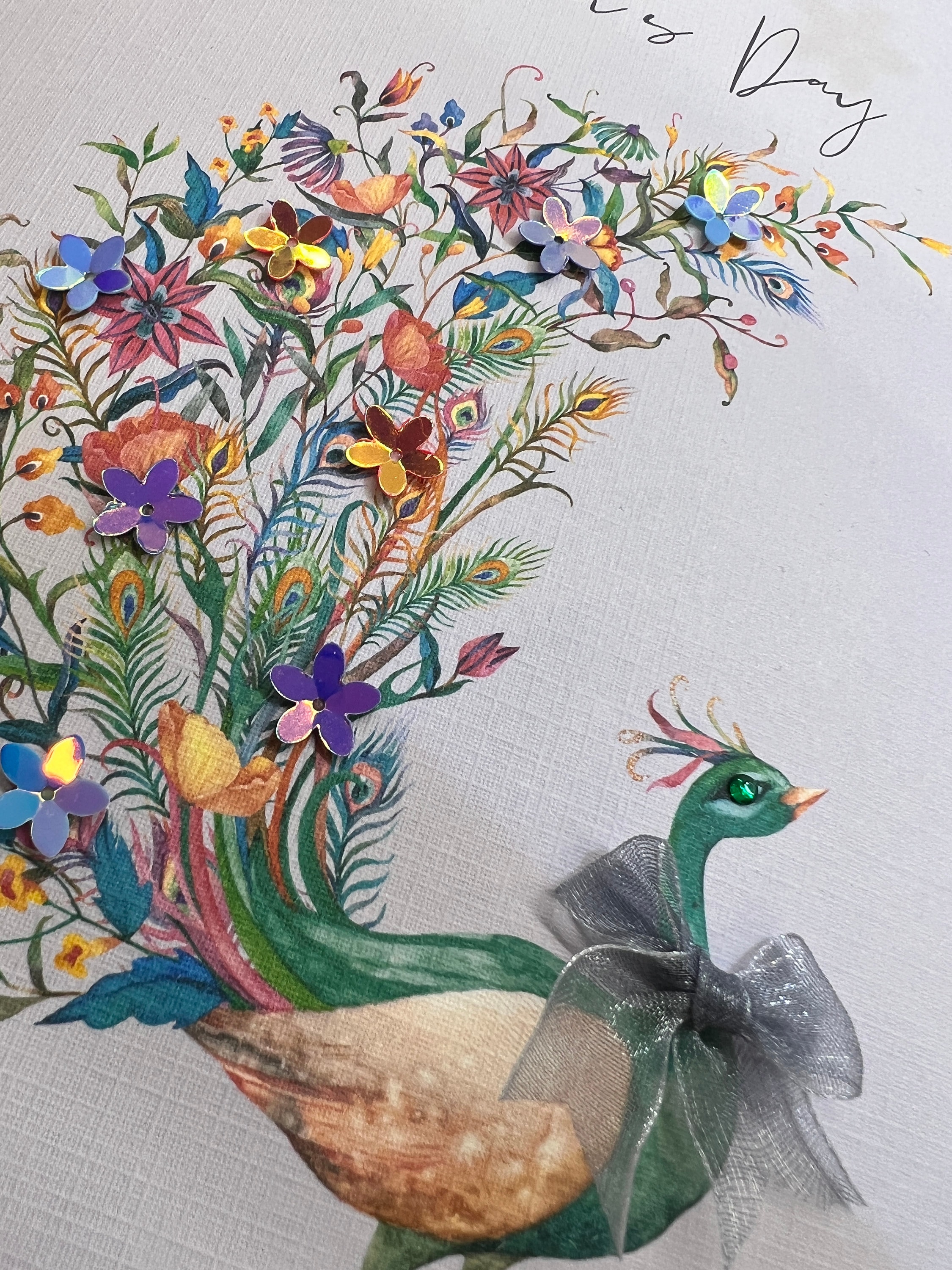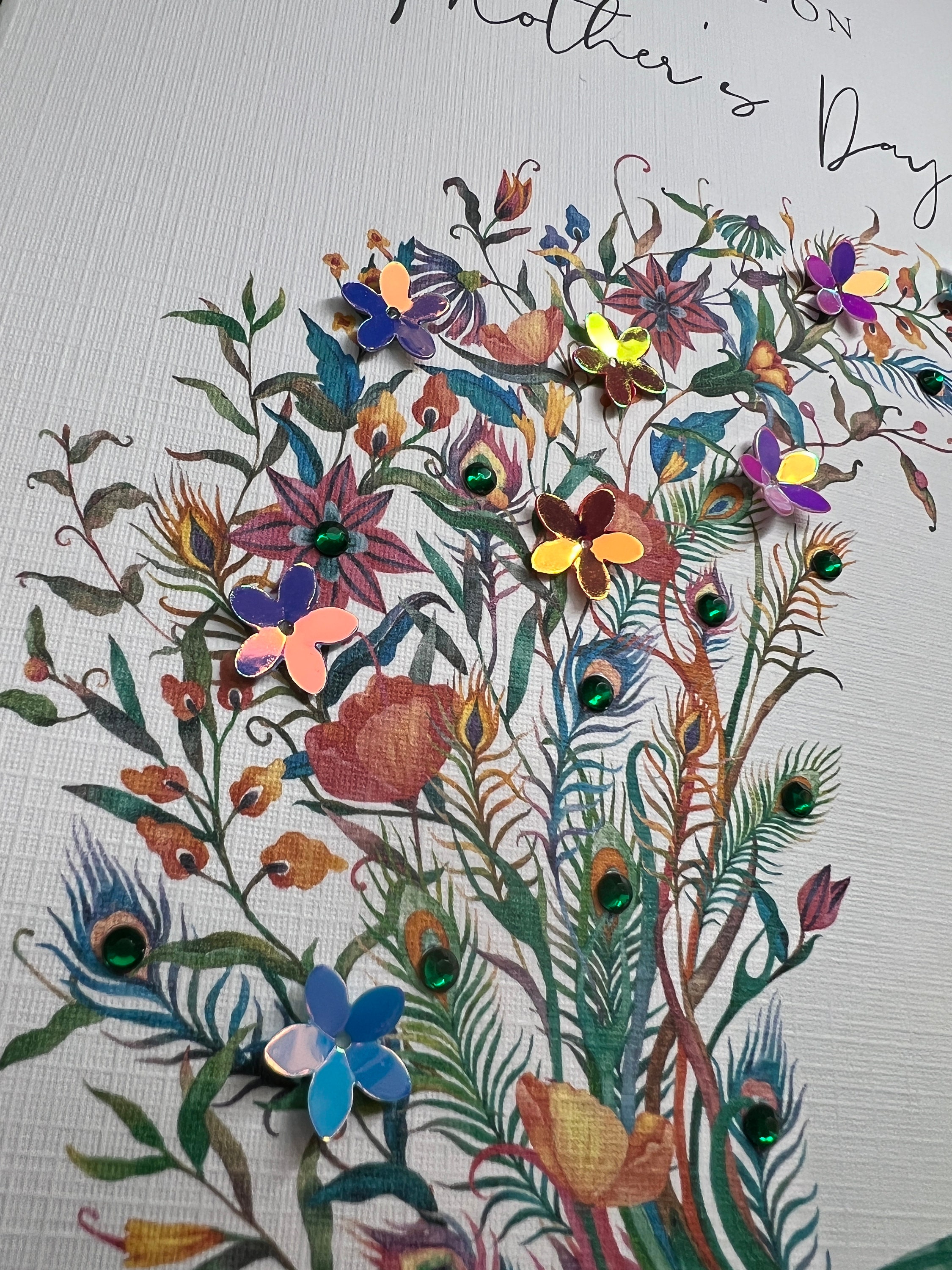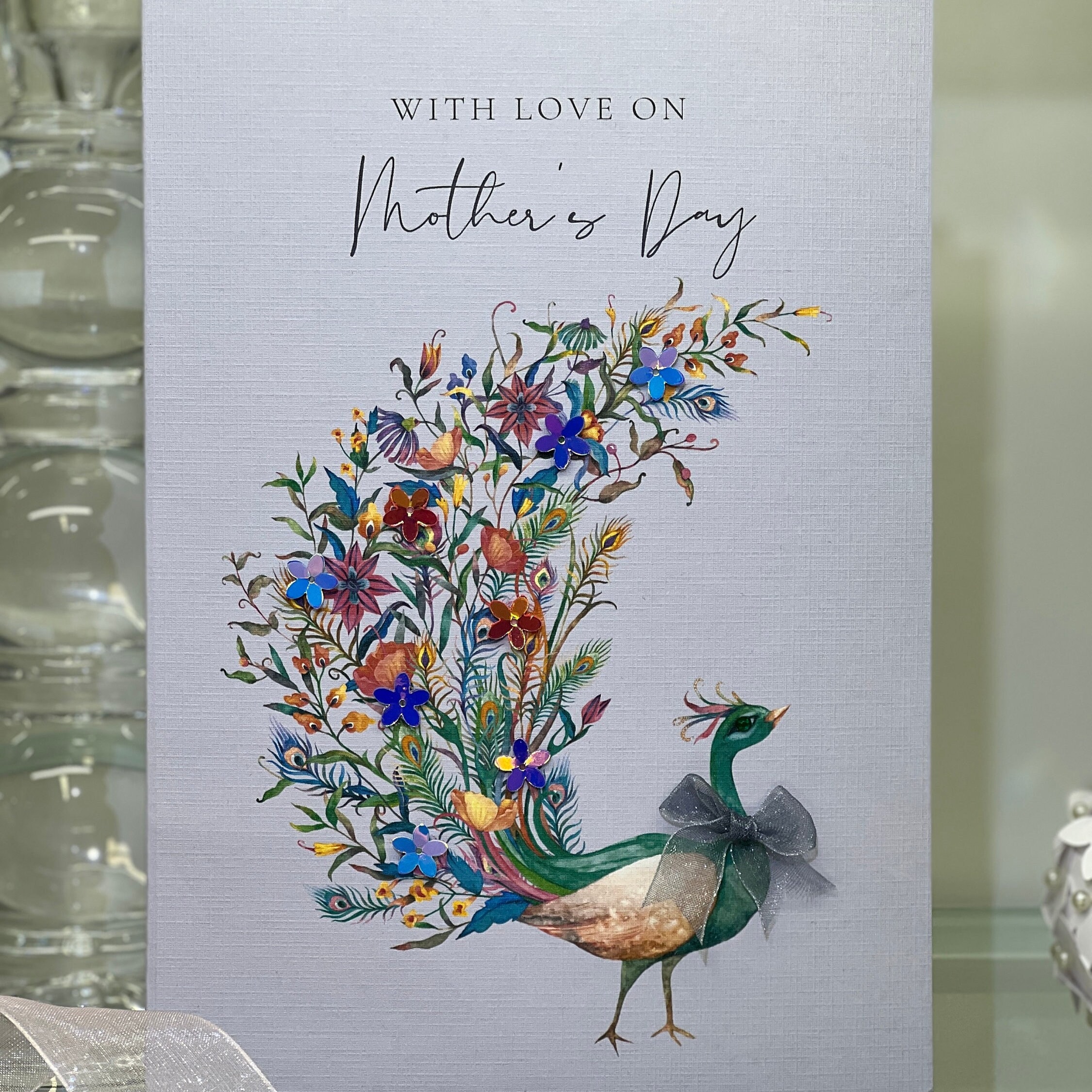 Muttertagskarte, Handgemachte Muttertagskarte, Pfauendesign mit 3D Blumen & Edelsteinen, Luxuriöse Muttertagskarte, Mit Liebe zum Muttertag
