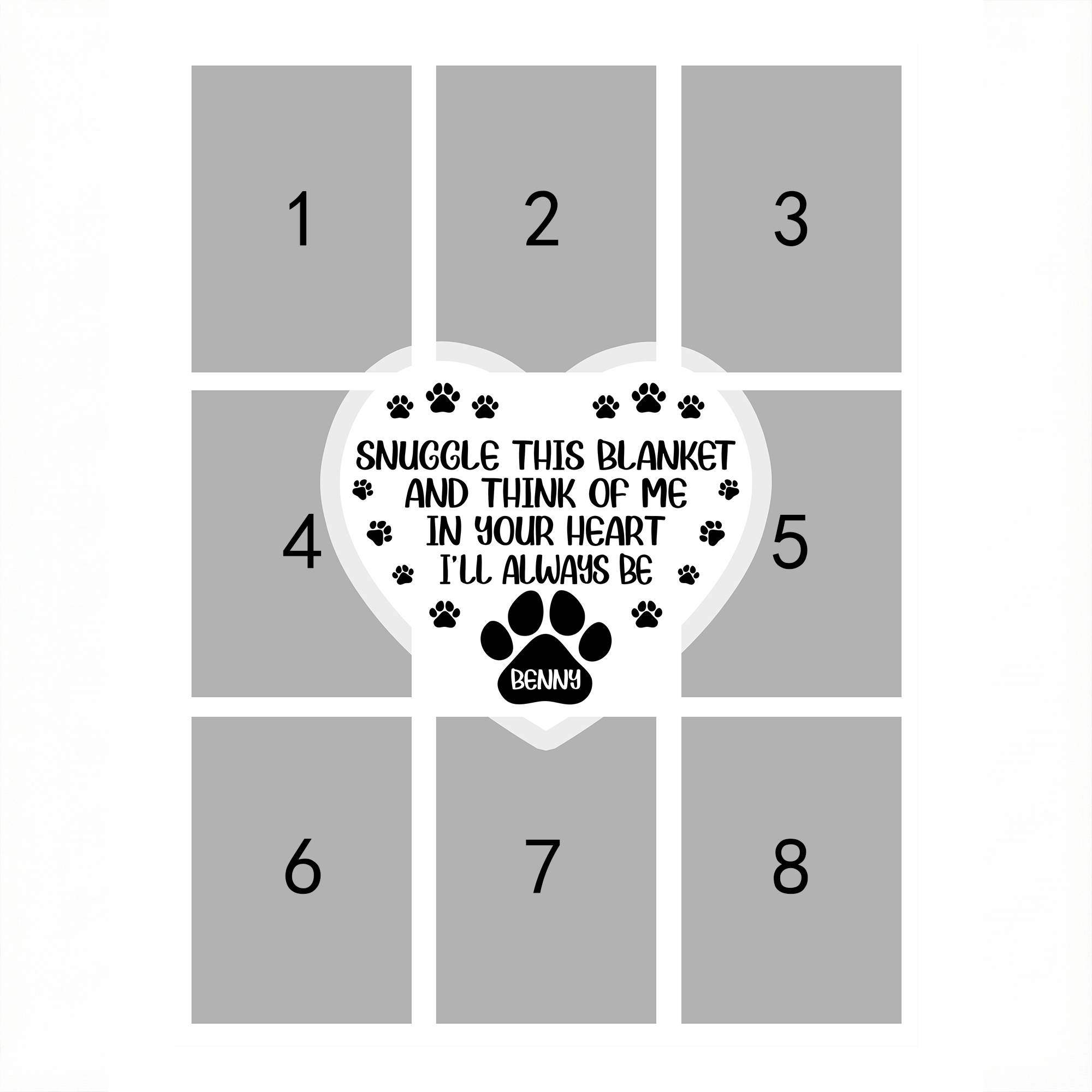 Herzförmiges Pfotenabdruck-Fotoraster-Design – Die Decke besticht durch einen warmen Herzrahmen und ein Layout mit Pfotenabdrücken, das die besondere Bindung zwischen Haustieren und ihren Besitzern symbolisiert. Das klare Fotoraster hebt jedes Tierfoto deutlich hervor und schafft so eine gemütliche und emotionale Atmosphäre, die sowohl in moderne als auch in wohnliche Räume passt.