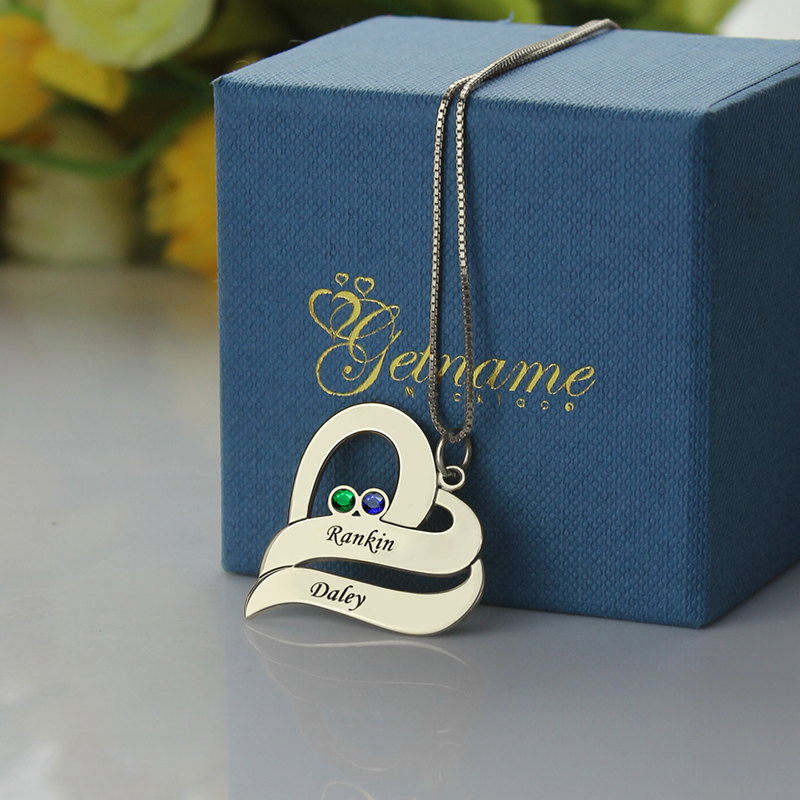 Individualisierte Namenskette aus zwei Herzen mit Geburtsstein