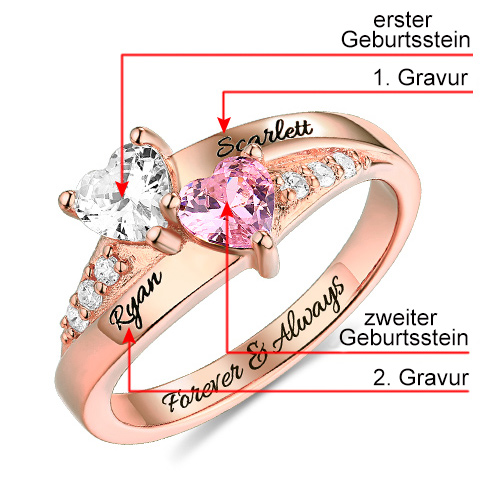 Ring mit zwei Geburtssteinen in Herzform Rosa Gold Silber 925