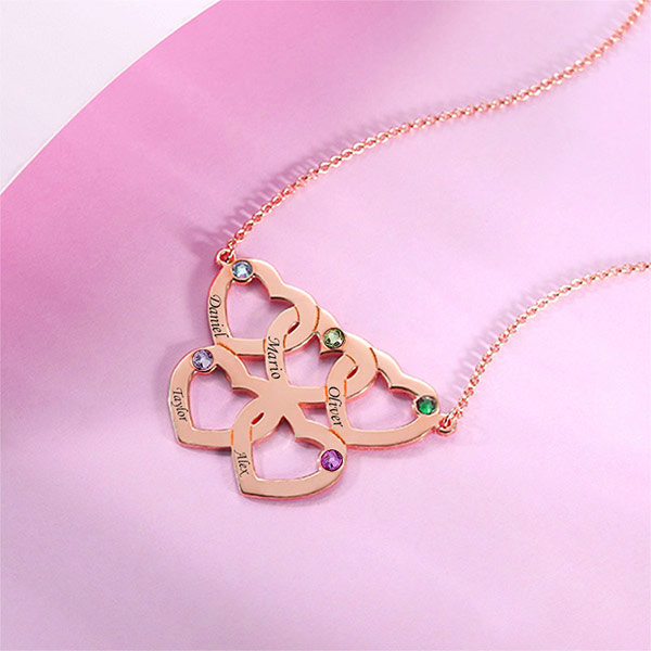 Gravierte Halskette mit fünf Herzen Geburtssteine in Rosegold