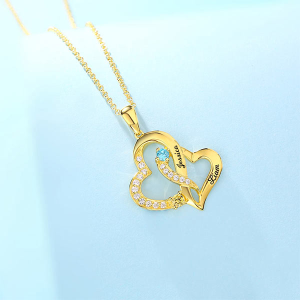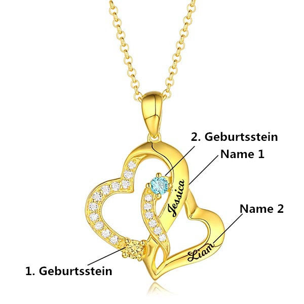 Personalisierte Doppelherz Halskette mit 2 Namen und Geburtssteinen in Gold